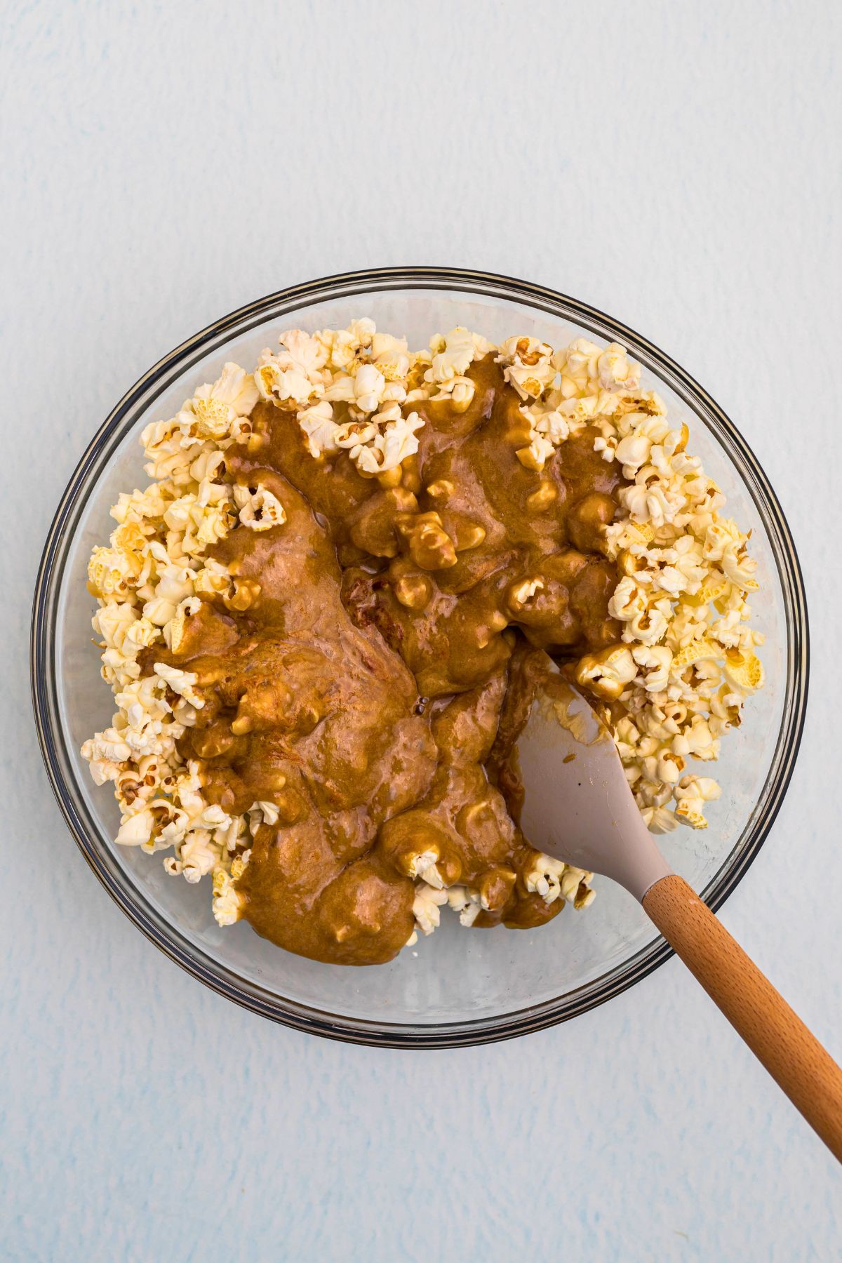 - Immediately pour the caramel sauce over the popcorn and toss to coat evenly.