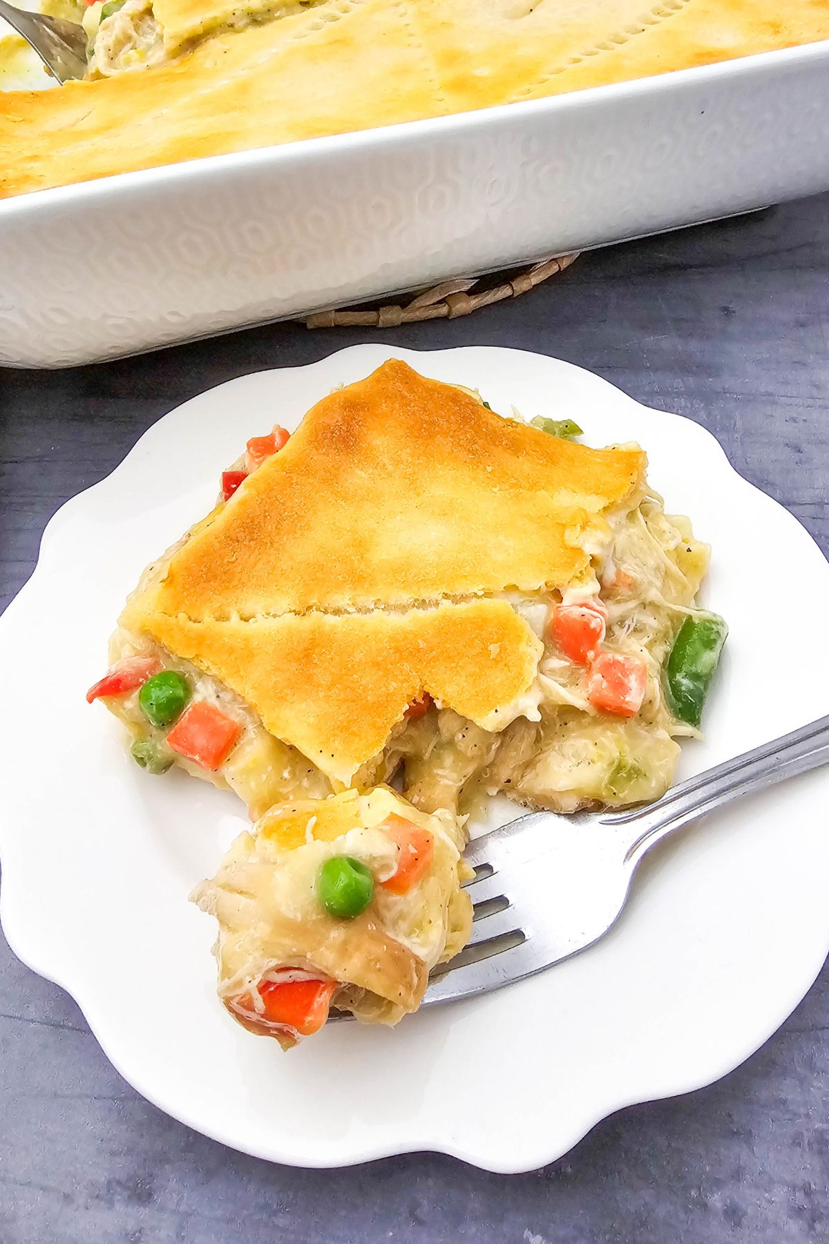 This easy chicken pot pie casserole recipe is one of my favorite “simple” meals. It has all the warm, creamy flavors of a classic pot pie, but is made in one dish, making it perfect for busy nights.