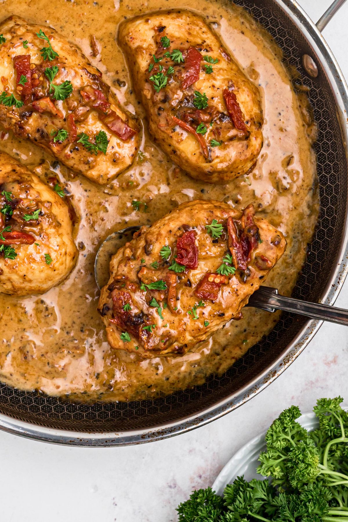 STEP 5: Add the chicken back into the skillet, spooning some sauce over the top. Let it simmer for 10-12 minutes until the chicken is cooked through. It should reach an internal temperature of 165°F.