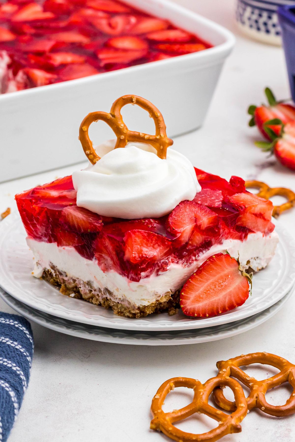 - Chill the salad in the fridge for about 3–4 hours, or until the Jell-O is fully set. Slice and serve with whipped topping, extra strawberries, and pretzels if desired.